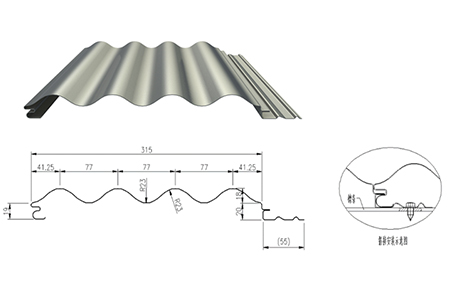 ● HL38-315型隱藏釘式墻板,使用展開(kāi)寬度為500mm的彩涂板,適合厚度0.5-0.7mm。適應(yīng)于橫鋪墻面。表面為波浪型,承載能力強(qiáng)、外觀新穎、美觀大方,獨(dú)特的防水性能,主要適用于辦公樓、工業(yè)廠房、大型的公共建筑物墻面。