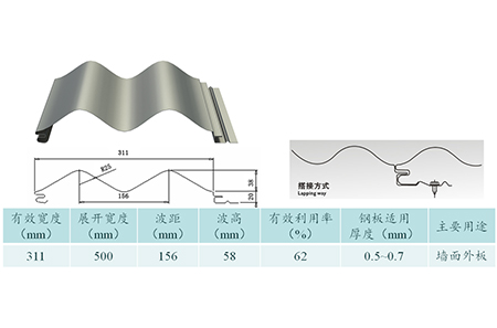 ● HL58-311型隱藏釘式墻板,使用展開寬度為500mm的彩涂板,適合厚度0.5-0.7mm。適應于橫鋪墻面。表面為波浪型,承載能力強、外觀新穎、美觀大方,獨特的防水性能,主要適用于辦公樓、工業(yè)廠房、大型的公共建筑物墻面。